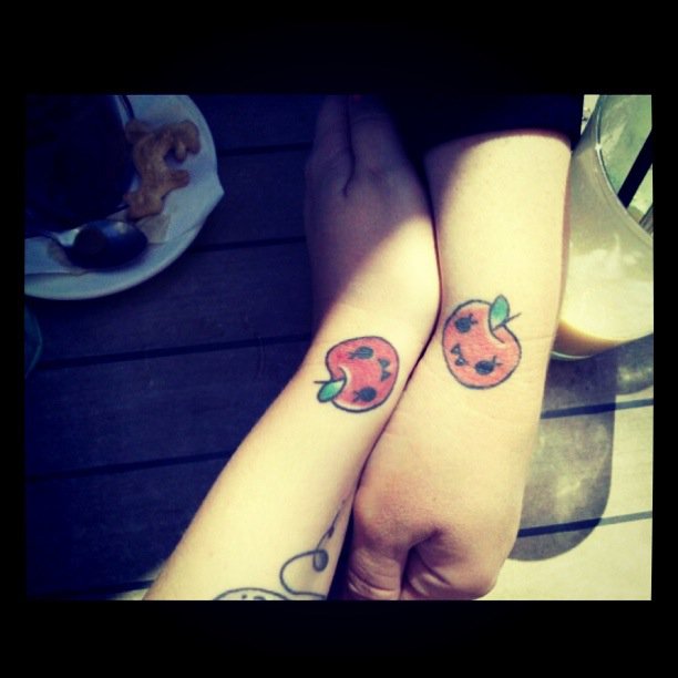 heart padlock on my right arm, Varga girl pin up on my right arm, lots of roses on underside my right arm, Purple rose on my left front shoulder, a heart on the back of my neck with the words 'Plus Que Ma Propre Vie" written on it- translates to "More Than My Own Life", sugar skull on my back, 2 Diamonds, one in my ditch, one on my right wrist with the word "Loyalty" above it, a classic girl head on my right arm, a key on my right arm. Both of my sisters names, "Paige Marie" on my right arm below my ditch, and "Courtney Anne" on the same place on the left arm above the pink cupcake! cupcake behond my right ear, evil apple tattoo on my left wrist. The last two are bro tats with besties:)